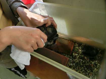 かめの甲羅が汚れていたため、掃除をしてくれました。