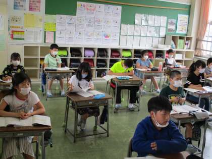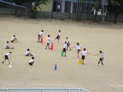 5年生は、体育科の学習で、折り返しリレーをしています。しっかり間を空けて並んでいます。