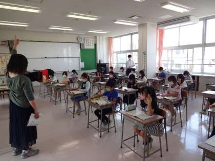 音楽専科の先生と一緒に、歌を歌ったり歌に合わせて動作をしたりしながら、音階の学習をしました。