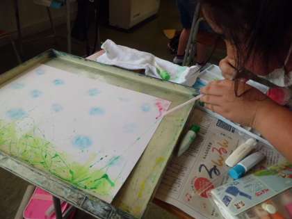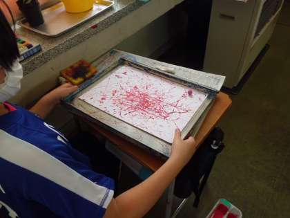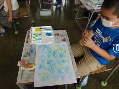 図画工作科の時間に、絵の具を使ったさまざまな技法を使って、もようを描きました。歯ブラシに絵の具をつけて網目をこすったり、ストローで画用紙にのせた絵の具に息を吹きかけたりしました。他にも、ビー玉をころがしたり、段ボールで型押ししたりして、思い思いの「ゆめもよう」を描きました。
