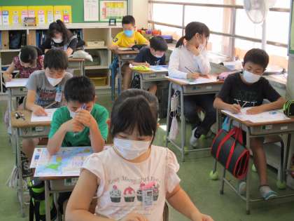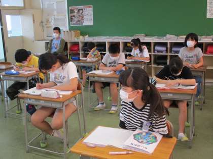 5年生は、社会科の学習で、世界の国々の名前や日本の地形等を調べながら、プリントにまとめています。