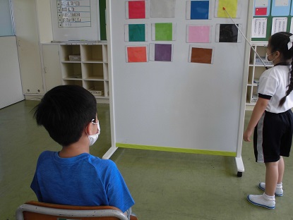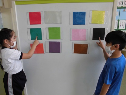 色の名前を繰り返し声に出して練習したり、「色探しゲーム」をしたりしました。様々な色の名前を覚えることができました。