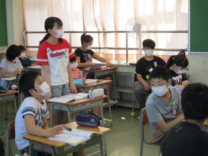 4年生、6年生は、算数の計算問題の答え合わせをしています。