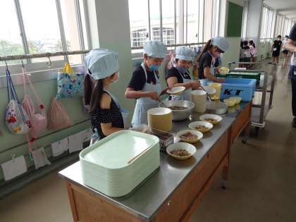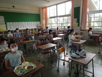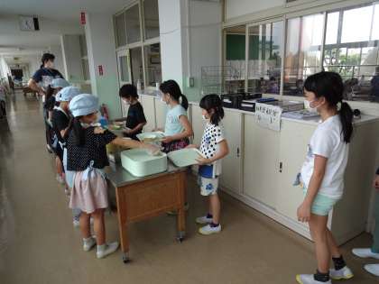 今日から、配膳しやすい給食がスタートしました。給食当番を少なめにした、盛りつけ工程の簡単な献立の給食です。