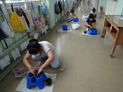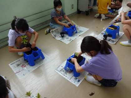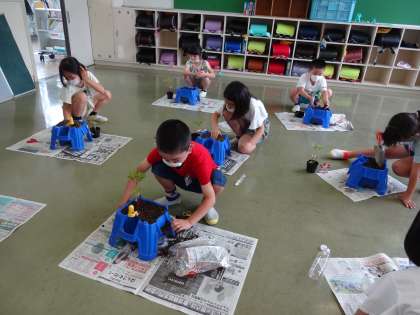 ポットで育ててきたホウセンカを、鉢に植え替えました。