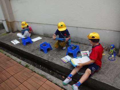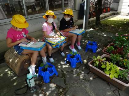 野菜の苗が、すくすく育っています。今日は、自分の野菜の様子を観察カードに記録しました。