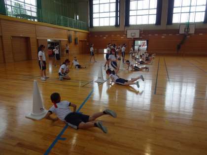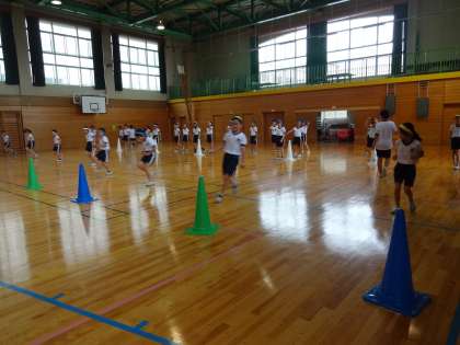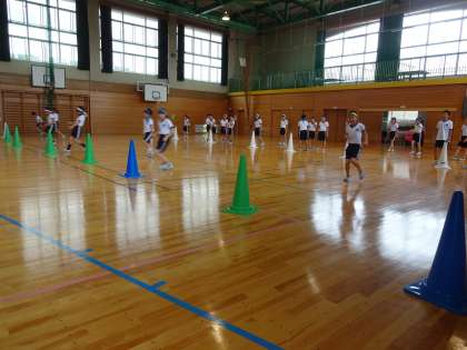 様々な運動条件で体育館内をダッシュし、走力に加え、巧緻性、敏捷性等の能力を高めました。