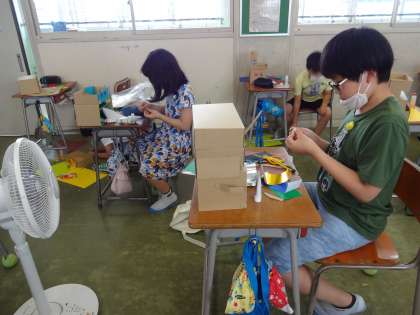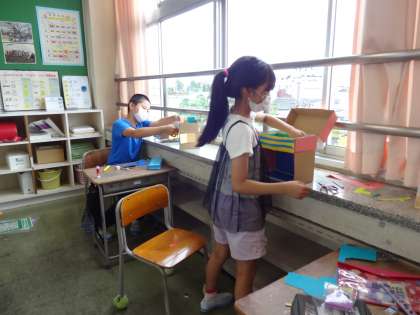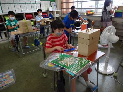 段ボールの特徴を生かして、自分の物を入れる箱を製作中です。イメージを膨らませながら飾り付けを工夫しています。
