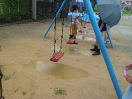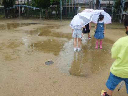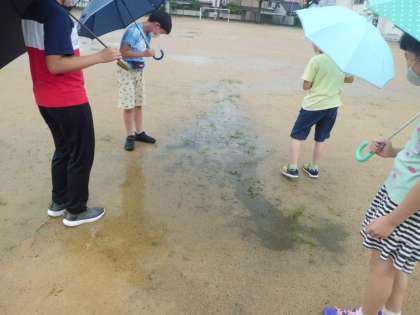 雨水がどのようなところに集まるのか、グラウンドを調べに行きました。普段、雨の日にグラウンドに出ることのない子供たちは、想像以上に水がたまっている場所があることに驚いていました。「ブランコの下がすごくたまっているよ。」「でこぼこしているところや、低くなっているところにたまっている!」とたくさんの発見をしていました。