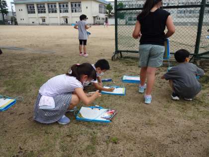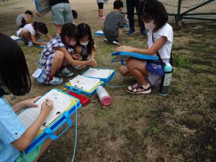 ダンゴムシを捕まえ、手のひらに乗せて観察する子供が何人もいました。