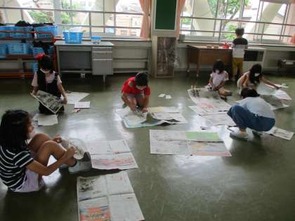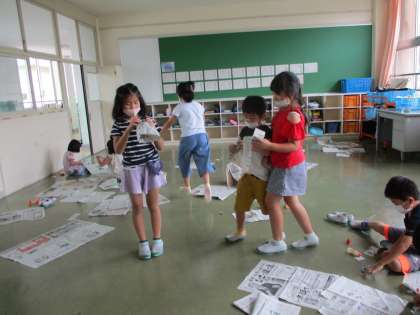 今日の図工は新聞紙とガムテープを使って、服を作ったり、家をつくったりしました。新聞紙を丸めたり、長くしたりして、工夫しながら作りました。