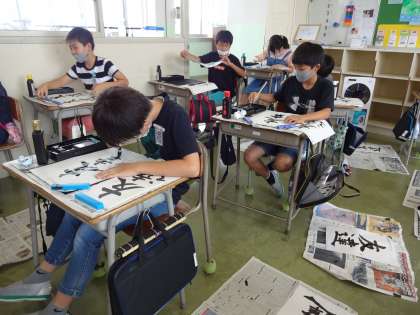今日から「友達」を書きました。前回「道」で気を付けた「しんにょう」の組み立て方の練習を生かして取り組みました。また、「友」の「左はらい」「右はらい」の筆の運び方にも気を付けました。