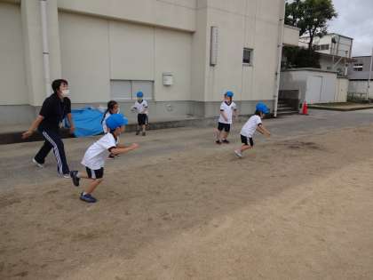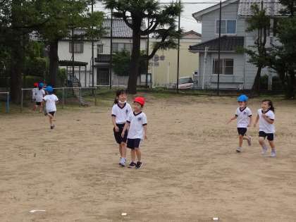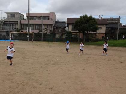 今日は、各団が交替しながら鬼役になり、みんなで鬼ごっこを楽しみました。元気いっぱいに、グラウンドを駆け回りました。
