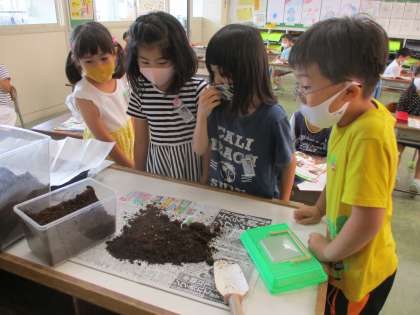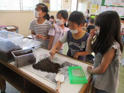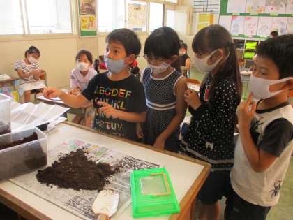 カブトムシの卵を食い入るように見る2年生の様子です。もう、卵を産んだのです。