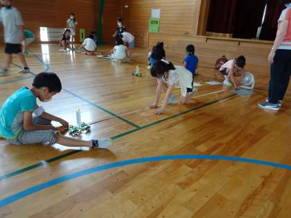 送風機を使って、強い風を受けて走る車と、弱い風を受けて走る車の進む距離の違いを調べました。