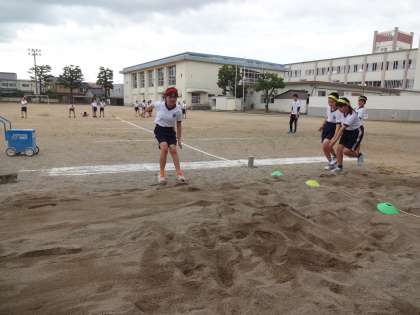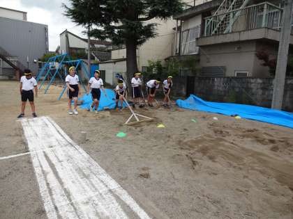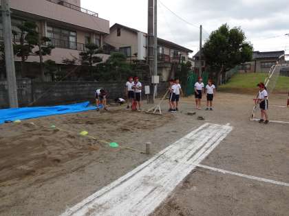出発合図をする人、レーキで砂をならす人、記録を測る人など、役割分担しながら自分たちで測定できるチームワーク抜群の子供たちです。