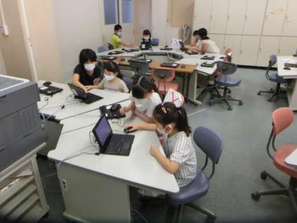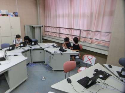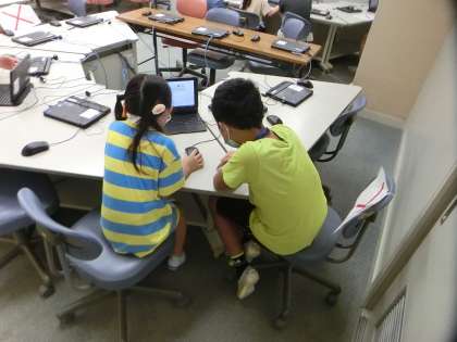 7/28(火) 1、6年生 「タブレットPCをつけるボタンはここにあるよ」