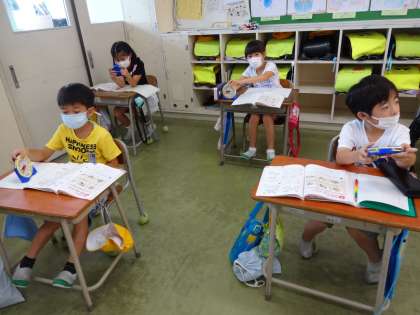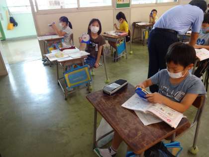 手に時計の模型を持ち、時刻を合わせて答える子供たち。