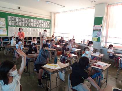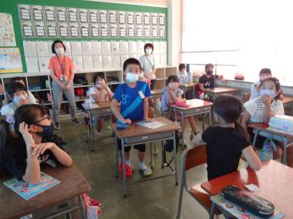 果物名やスポーツ名などの英語での答え方を学び、ALTの先生のまねをして、元気よく発音しました。どの絵カードが隠されたかのクイズでも、たくさんの子供たちが挙手しました。