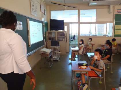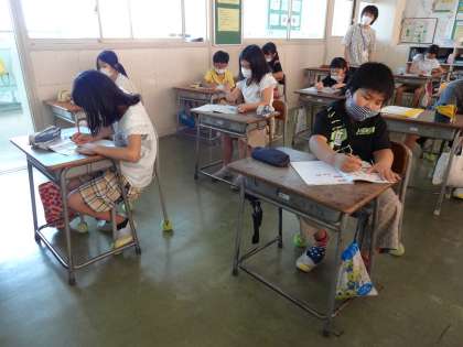 リスニングにも挑戦しました。スピーカーから流れる会話を聞き、教科書に答えを書きました。