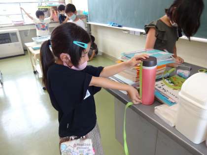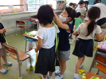 一人一人が手に紙テープを持って、教室内を行ったり来たり。