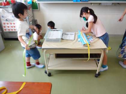 紙テープに、測りたい物の長さを写し取っています。それらを使って、長さ比べをします。量感を捉えるために、体験活動を大切にしています。