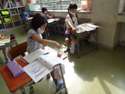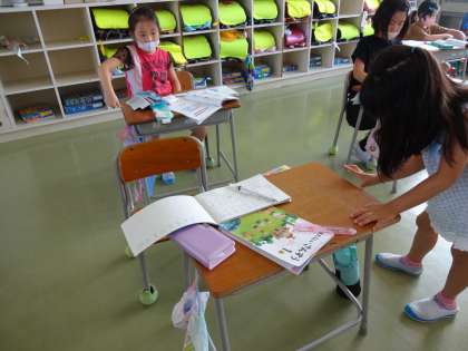 昨日は、紙テープを使って、物の長さ比べをした子供たち。今日は、紙テープを使わないで、長さを測る方法の学習です。