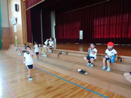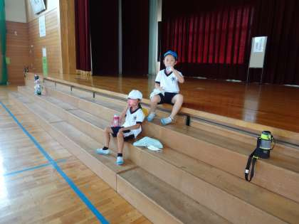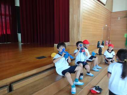 鬼ごっこの後は、しっかり水分補給をして休息しました。