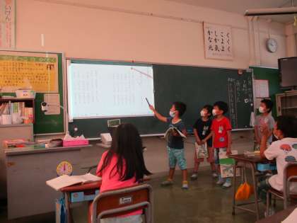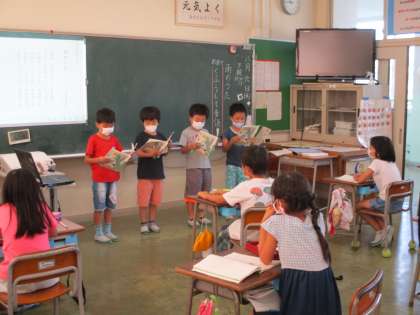 「雨のうた」の詩をグループに分かれて、工夫して音読発表をしました。その後にはどこを工夫したか、ミニ先生になりみんなに教えました。