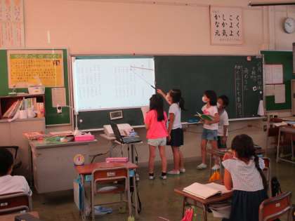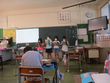 写真はA班です。A班は、雨の音がある段落は小さく、音がないときは大きくと強弱をつけて音読しました。