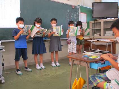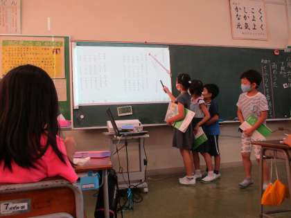 写真はB班です。B班は、みんなで合わせて音読するために秒数を心の中で数えて音読しました。