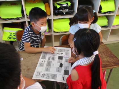 夏休み明けということで、夏休みを題材にしたすごろくをグループに分かれてしました。マス目には、「夏休みに食べたおいしかった食べ物はなんですか?」「かき氷を食べましたか?」など、質問のマス目があります。