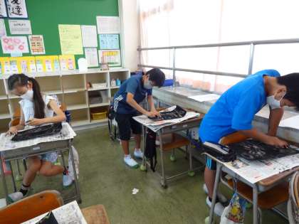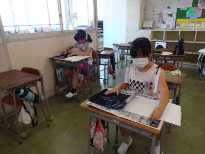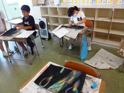 いよいよここからが、作品づくりの楽しさを味わえます。消しゴムで消していくと、いろいろな形や色が出てきます。力の入れ方、消す線の太さも工夫しながら、取り組みました。