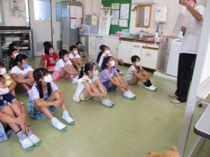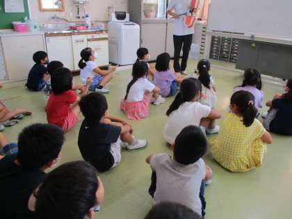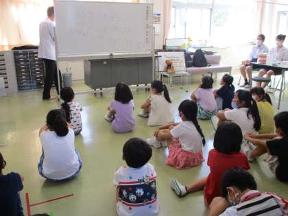 写真は歯の授業を受けている様子です。歯磨きの仕方や歯の大切さを学ぶことができました。