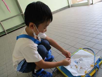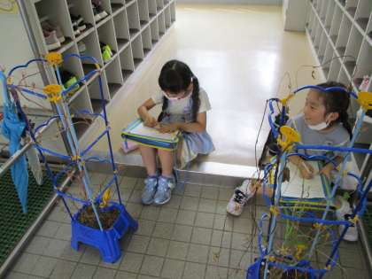 「種が一つずつお部屋に入っているよ!」「こっちには4個、こっちには5個入っているよ。あわせると9個だ!算数の勉強だね。」「本当だ〜!」と、気付いたことを口にしながらそれぞれのアサガオを観察しました。