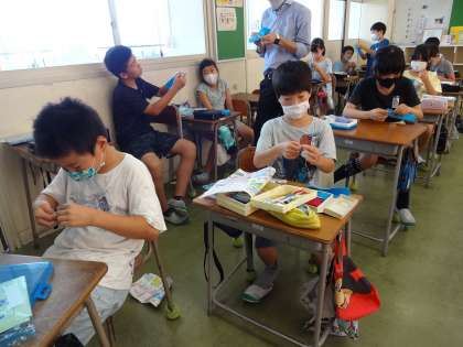 裁縫の学習で、かがり縫いに挑戦しました。フエルトを縫って、ペンケースを製作しました。裁縫技能に個人差はありますが、みんな真剣に取り組みました。