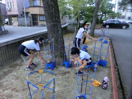 1年生が育てている朝顔の鉢が風で倒れているのを発見し、自然と体が動いた6年生たち。