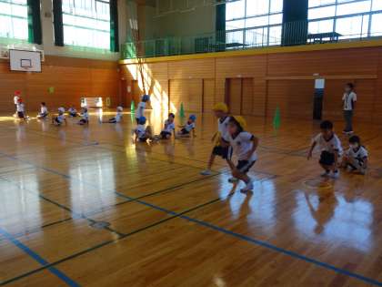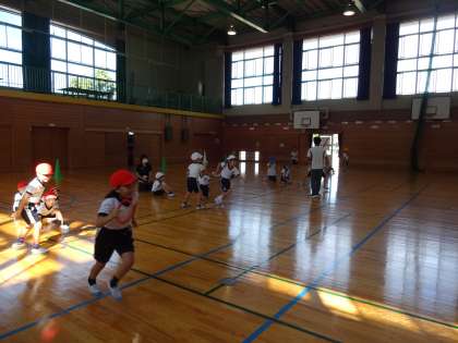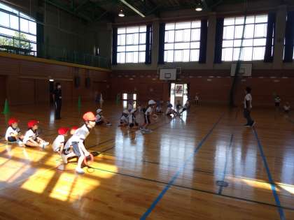 1年生と2年生が向かい合い、リングバトンを使って交互にバトンパス。