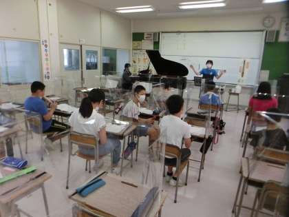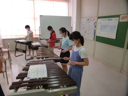 音楽科の学習で『雨の歌』の合奏の練習をしている6年生。