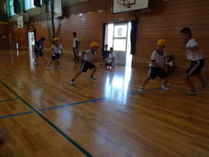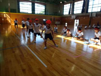 2限に2年生は、体力テスト種目の反復横跳びをしました。5年生は、2年生の回数を数えました。また、先頭に立ち、お手本も見せました。