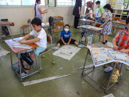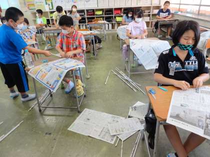 今日は、新聞紙を丸めて、たくさんの棒を作りました。