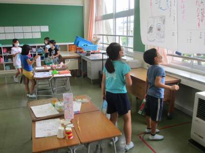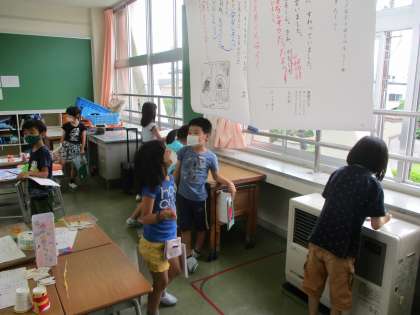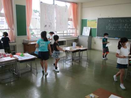 算数科の学習で、身近にある三角形や四角形を探しました。発表では、「ロッカー」「屋根」「カーテン」等、たくさん発表することができ、発表の物以外にもたくさん見つけることができた2年生でした。