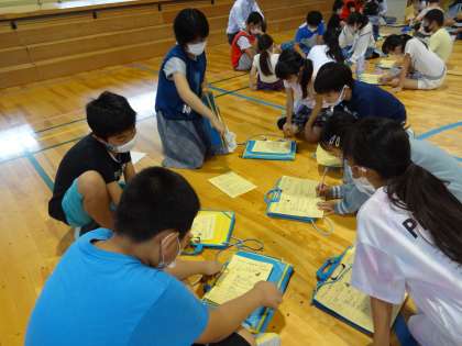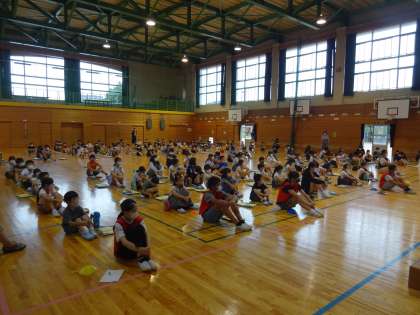 全校児童が体育館に集まり、縦割り班ごとに「なかよし遠足」の打合せを行いました。