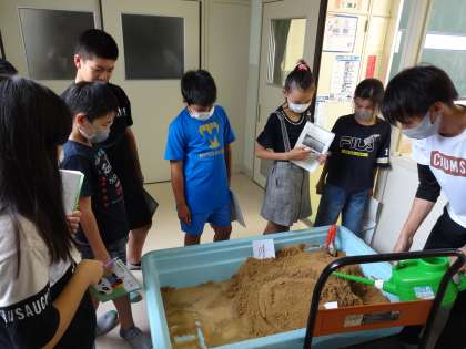 曲がった川に水を流し、カーブの外側と内側の様子を観察しました。
