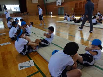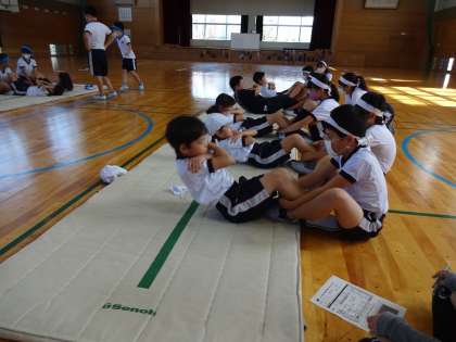 体力テストの上体起こしの測定をしました。30秒間で何回できるか、自分の力を試しました。