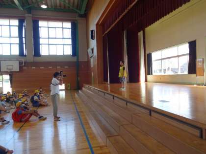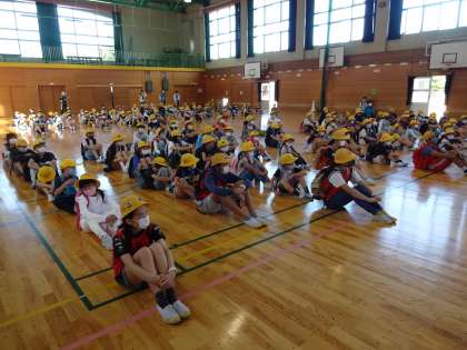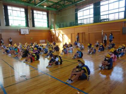 待ちに待った「なかよし遠足」です。8時50分に、全校児童が班ごとに体育館に集合し、出発式を行いました。
