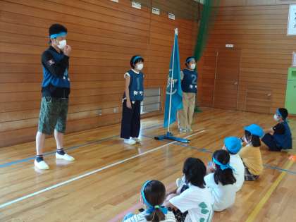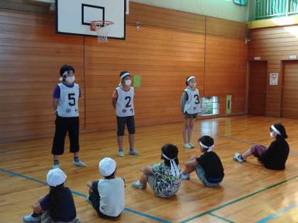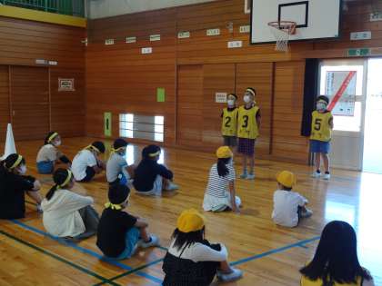 団役員や担当の先生の紹介をしました。また、ミニ運動会に向けて、かけ声をかけ、士気を高めました。