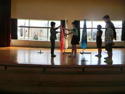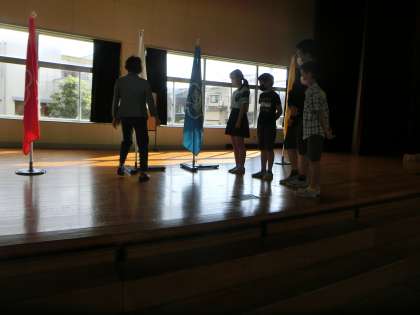 朝の時間に校長先生と団長の子供たちが結団式の動きの確認をしました。