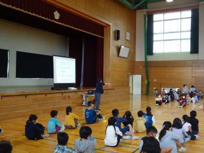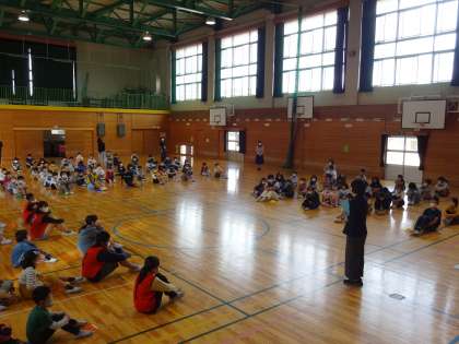 午前8時25分から「さわやか集会」を行いました。今日は、生徒指導の先生が、全校児童へ、「あったか言葉」についての話をしました。