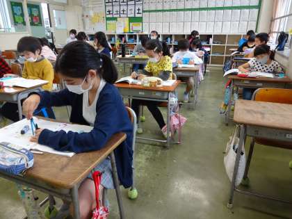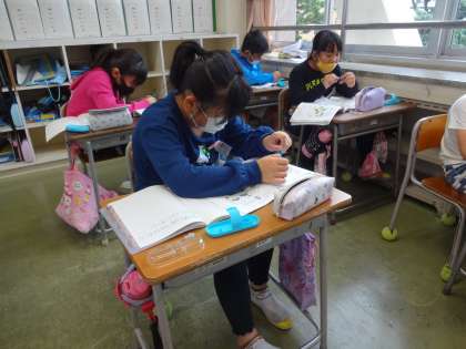 昨日からコンパスを使い始めた子供たち。今日は、コンパスを使って長さを写し取る学習をしました。コンパスの使い方に慣れようと一生懸命に取り組んでいます。